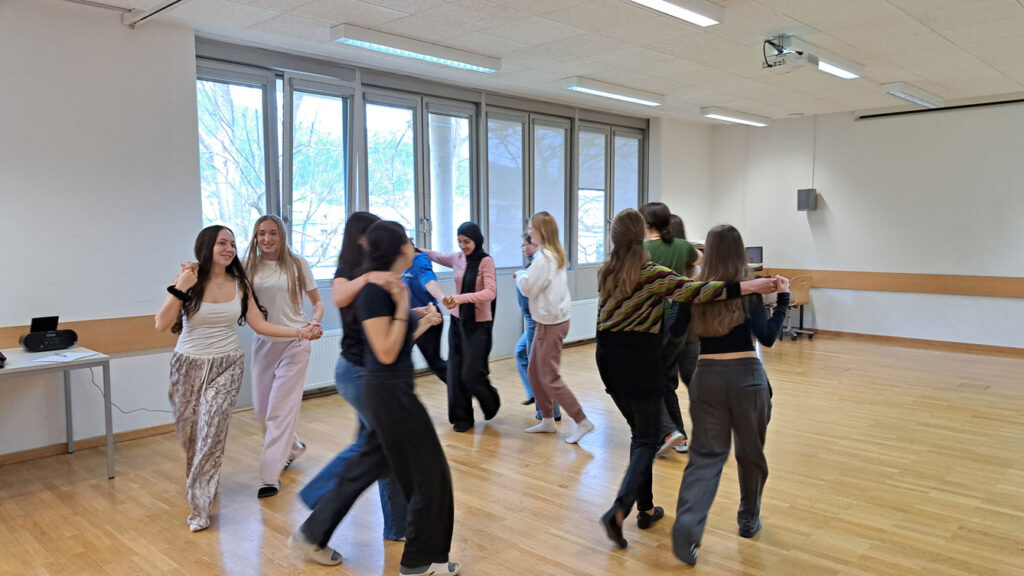 Wie haben die Leute im Mittelalter getanzt? Das konnten die Schülerinnen der 3ak und 3bk im Workshop über historische Tänze mit Margie Sackl (Rhythmuspädagogin & Musikerin & Tänzerin) ausprobieren.